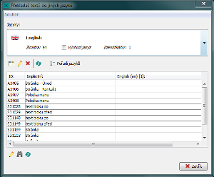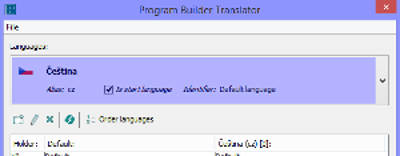 V dialogovém okně Translatoru můžete editovat seznam poskytovaných jazyků. Ovládací prvky pro editaci jazyků jsou pod combo boxem. Aplikace vždy obsahuje implicitní jazyk. Jeho text se použije vždy když není nastaven text odpovídajícího daného jazyka.
