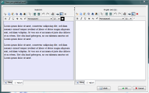 Před editací textů vyberte jazyk. Po zvolení jazyka se zobrazí seznam providerů s texty, které můžete překládat. Dvojklikem na provider se otevře editor, kde je vlevo text implicitního jazyka a vpravo text v jiném jazyce. Editor je zobrazen na následujícím obrázku.